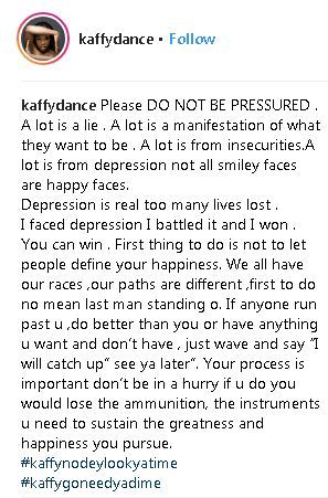 Professional Dancer, Kaffy has revealed that she once suffered from depression. The mother-of-two made this known while advising Nigerians against being pressured.