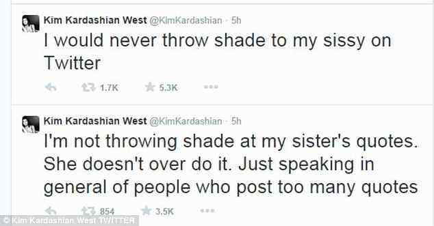 ‘I’m not throwing shade at my sister’s quotes,’ she tweeted. ‘She doesn’t over do it. Just speaking in general of people who post too many quotes.’