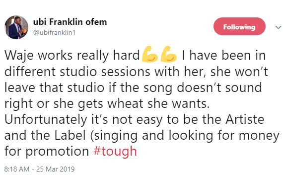 ‘Waje works really hard I have been in different studio sessions with her, she won’t leave that studio if the song doesn’t sound right or she gets wheat she wants. Unfortunately it’s not easy to be the Artiste and the Label (singing and looking for money for promotion’