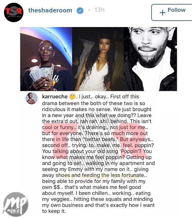 One person who is not the least bit amused by the drama is Karrueche herself. After days of watching her ex and the young rapper go at each other in her name, she took to Instagram to make her position on the matter known.