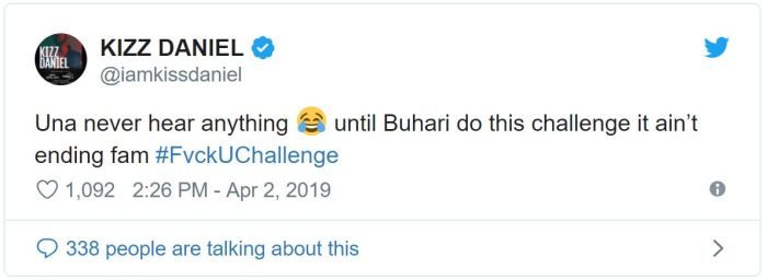 Kizz Daniel has shared that the ongoing fvckUchallenge which he started on social media is not ending anytime soon until President Muhammadu Buhari participates.