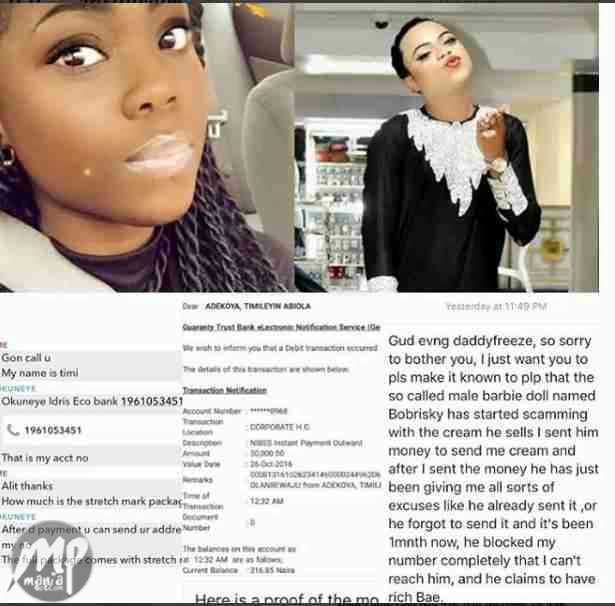 “Gud evng daddyfreeze, so sorry to bother you, I just want you to pls make it known to plp that the so called male barbie doll named Bobrisky has started scamming with the cream he sells I sent him money to send me cream and after I sent the money he has just been giving me all sorts of excuses like he already sent it ,or he forgot to send it and it’s been 1mnth now, he blocked my number completely that I can’t reachhim, and he claims to have a rich Bae.”