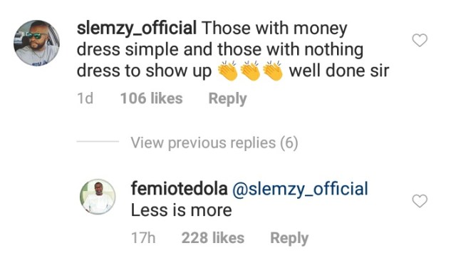 Billionaire, Femi Otedola who was dragged into an exchange by a follower over his ‘simple’ outfit, schooled the follower with three words – ‘less is more’ and that really captured the attention on his teeming followers.