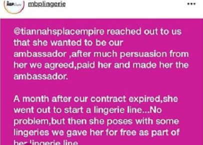 According to a post on their official Instagram account, Ms Toyin contacted them and asked she is made their ambassador. After so many persuasions, they claim they accepted her push, paid her and gave her free lingerie.