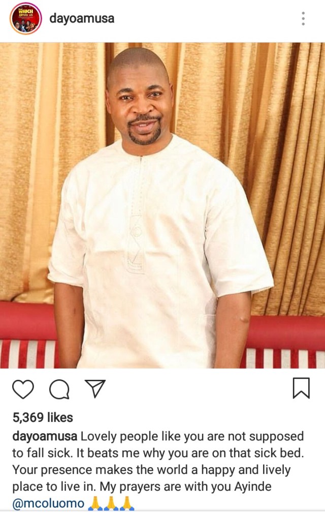 “Lovely people like you are not supposed to fall sick. It beats me why you are on that sick bed. Your presence makes the world a happy and lively place to live in. My prayers are with you Ayinde @mcoluomo,”