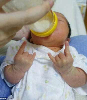 “Popular Japanese heavy metal singer, Nao Hazuki, shared a photo, claiming his new born daughter flipped the sign at just 10 days old.”
