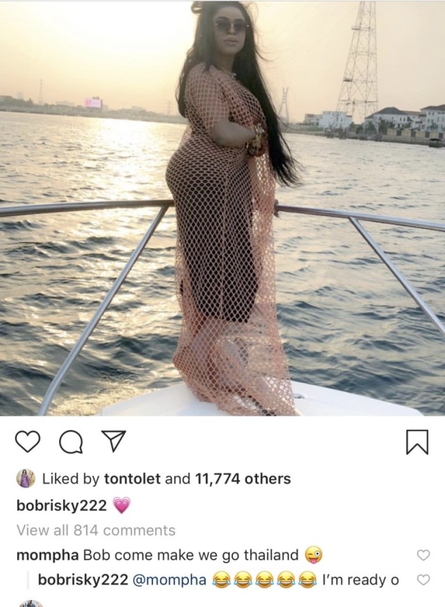 The effeminate shared a photo of himself living his best life on a boat and Mompha took to the comment section to invite Bobrisky to go on a trip with him to Thailand.