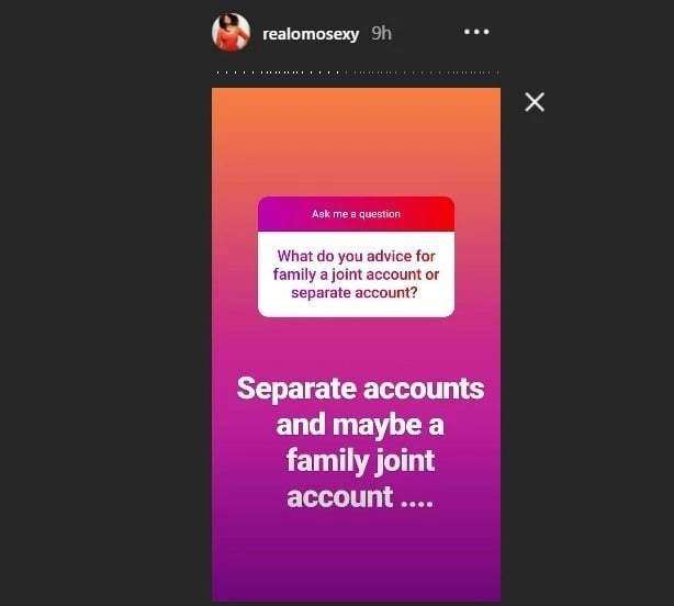 Asked about finances, she advised that a couple have separate accounts and maybe they could have a family joint account.