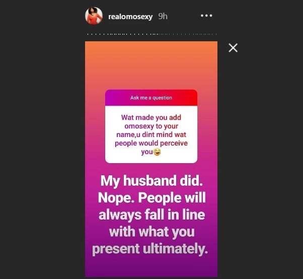 She said her husband did not mind that she began calling herself Omosexy besides; people will always fall in line with what is presented.