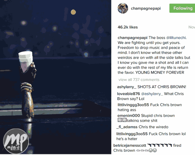 Yesterday, after Lil Wayne sparked a suicide scare by saying he was done and had given up because he was defeated, Chris Brown took to Instagram to hail him, calling him the greatest rapper alive and even said Wayne wrote most songs for his Cash money artists, which obviously includes Drake.