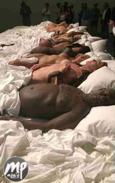 Kendall Jenner and Kim K shared these photos on their Snapchat accounts.They are wax figures of Kanye West, Kim K, ChrisBrown, Taylor Swift, Amber Rose, Donald Trump, Bill Cosby etc, from his Famous album, all Nak3d in a bed.