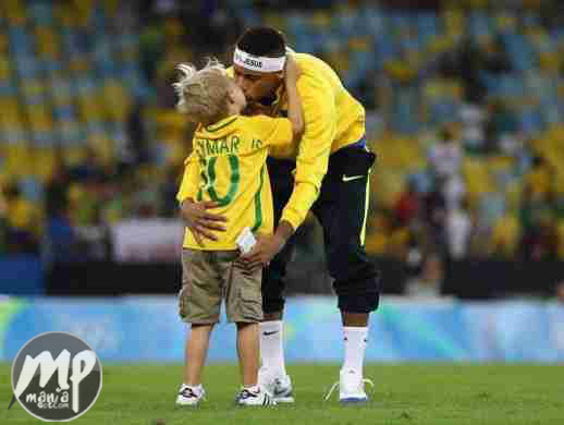 Adorable photos showing Brazil footballer Neymar Jr carrying and kissing his cute son Davi Lucca have just been released after Neymar inspired the host nation to win Gold in the Football event at the just concluded Rio 2016 Olympics.