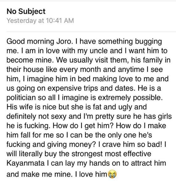 Relationship adviser, love doctor and online psychologist, Joro Olumofin has shared the story of a lady who wants to sleep with her uncle.