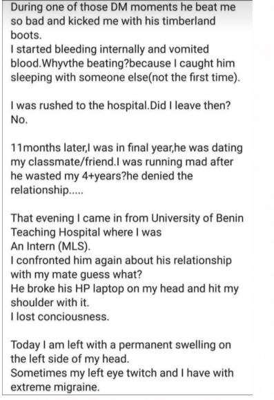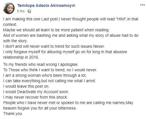 Sharing her ordeal with him on the platform, Temitope wrote in part,