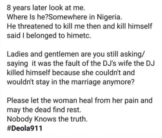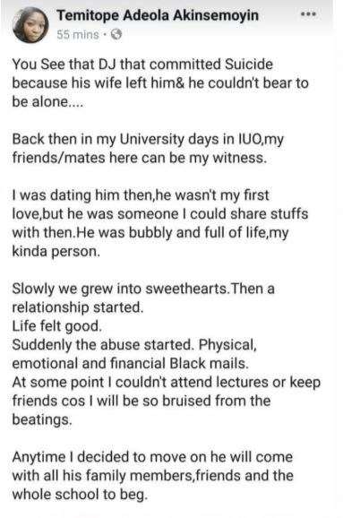 A Nigerian lady with the username, Temitope Adeola Akinsemoyin on Facebook, has shared the bitter experience she had while she was in a relationship with late DJ Xgee who committed suicide about two days ago.