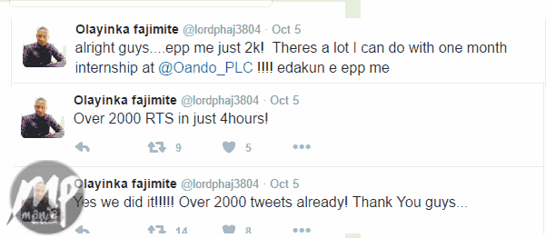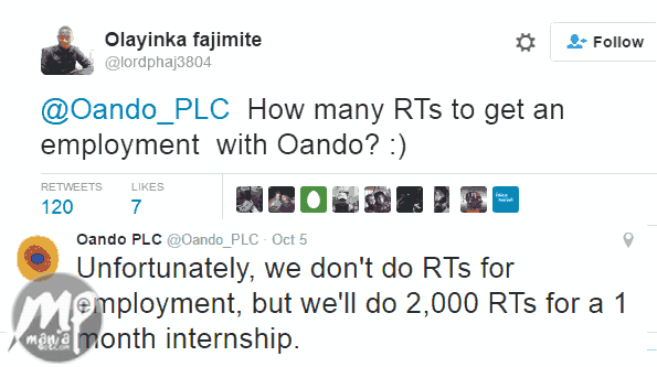 In response, Oando said though they don’t offer jobs based on retweets, they could offer him a one month internship if he gets 2000 retweets.