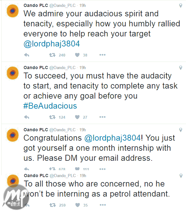 A Twitter user’s audacity landed him an opportunity to work as an intern with Oando PLC.