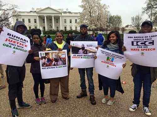 Nigerians in Washington DC have taken to the streets where they protested against Oba Akinolu asking Buhari to start justice with him.