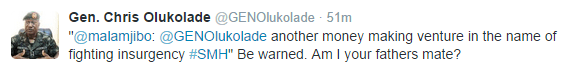 “Brigadier General Chris Olukolade is the Director, Defence Information. So the twitter user said to him “another money making venture in the name of fighting insurgency, SMH”. And the military spokesman man responded ‘Be warned. Am I you father’s mate’. lol. On twitter, nobody has respect, didn’t any one tell him before he signed up??.”