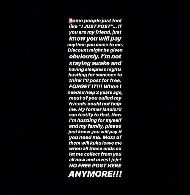 Popular Nigerian controversial social media enthusiast and blogger, Tunde Ednut shares new post as he says no free post even for his own friends who wasn’t there when he needed them the most.