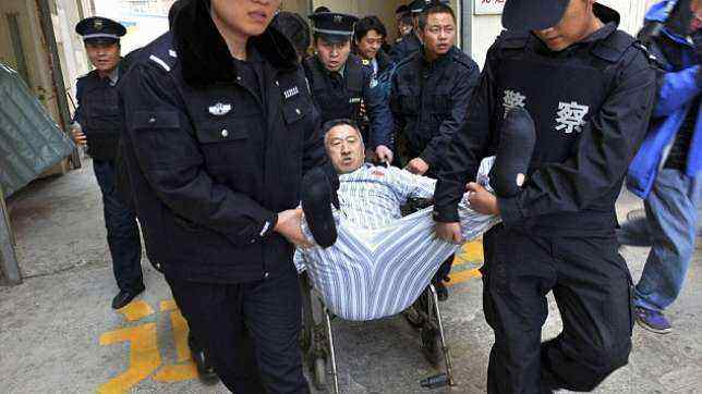 Policemen carry Mr Chen out of the hospital after being ordered to leave after spending more than three years there. (Reuters)