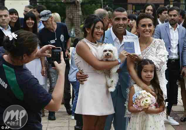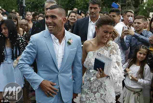 The 32-year-old outgoing Boca Juniors striker looked in an ecstatic mood on Thursday as he married his childhood sweetheart Vanesa.