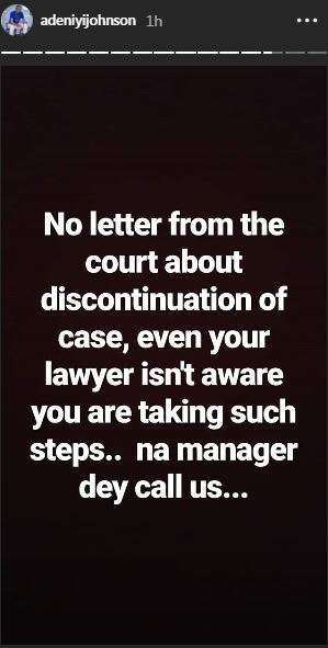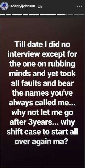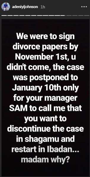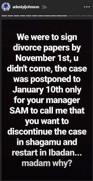 “We were supposed to sign divorce documents by November 1st, u didn’t come, the case was postponed to January 10th only for your manager SAM to call me that you want to discontinue the case in shagamu and restart in Ibadan…why madam? Till date I did no interviews except for the one on rubbin mind and yet took all faults and bear the names you call me…why not let me go after 3 years…why shift case to start all over again,” he wrote.