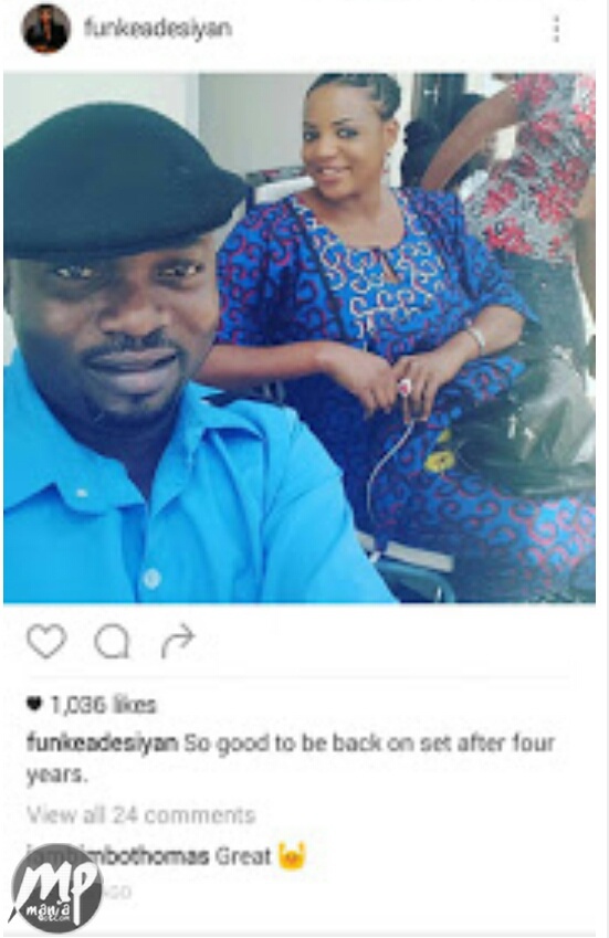 Popular Yoruba actress Funke Adesiyan who went off the acting scene for a while announced over the weekend that she was resuming acting and she shared pic of herself and colleagues on set yesterday.