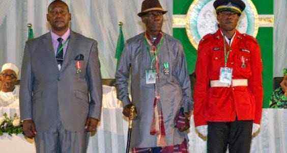 From left: Presidential steward, Onu Isaac Michael, Taxi driver, Imeh Usuah and traffic warden Cpl Solomon Dauda, conferred with the Member of the Order of the Niger, MON and MFR, today. Usuah was honored for returning N18million a passenger forgot in his taxi. The three of them were also given houses in Abuja.