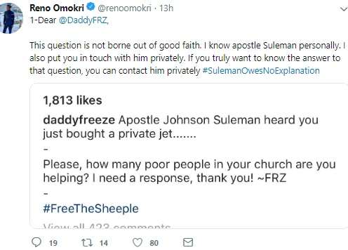 Dear @DaddyFRZ, This question is not borne out of good faith. I know apostle Suleman personally. I also put you in touch with him privately. If you truly want to know the answer to that question, you can contact him privately #SulemanOwesNoExplanation