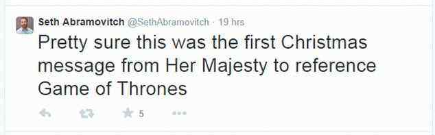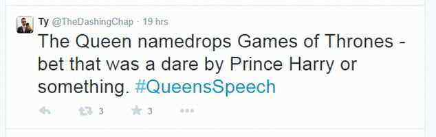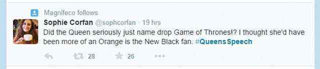 Following the mention in the Queen’s speech, Game of Thrones fans took to Twitter, with one, Sophie Corfan, exclaiming: ‘Did the Queen seriously just name drop Game of Thrones!? ‘I thought she’d have been more of an Orange is the New Black fan. #QueensSpeech’. Another, Caroline Carpenter, simply wrote: ‘Love that #GameOfThrones got a shout out in the Queen’s speech!’