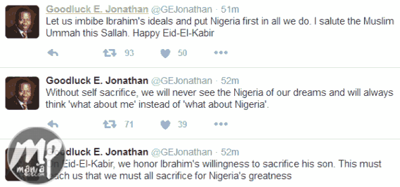 Former President Goodluck Jonathan took to his twitter handle to celebrate with Muslims in Nigeria who are joining their counterparts all overthe world to celebrate Eid-El-kabir. Date: 2016-09-12 Category: Gist & Gossip Tags: Eid-el-Kabir, goodluck jonathan