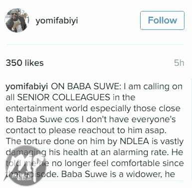 “ON BABA SUWE: I am calling on all SENIOR COLLEAGUES in the entertainment world especially those close to Baba Suwe cos I don’t have everyone’s contact to please reach out to him asap. The torture done on him by NDLEA is vastly damaging his health at an alarming rate.