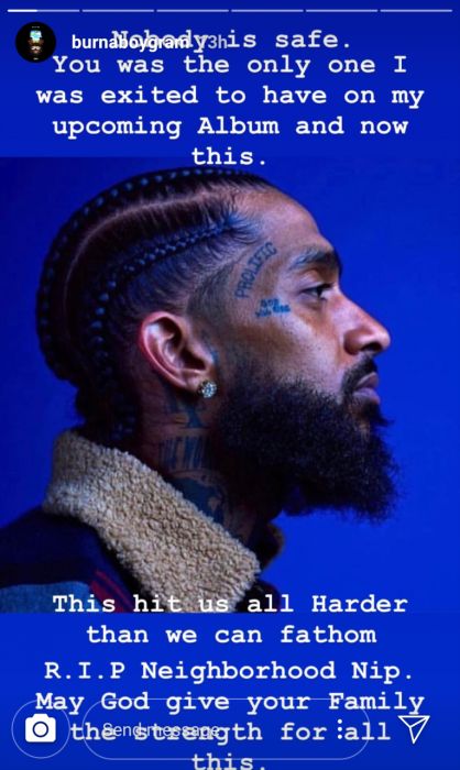 Burna Boy and Nipsey had a track coming which was slated to be on his incoming album and he was especially excited about working with the Grammy nominee.