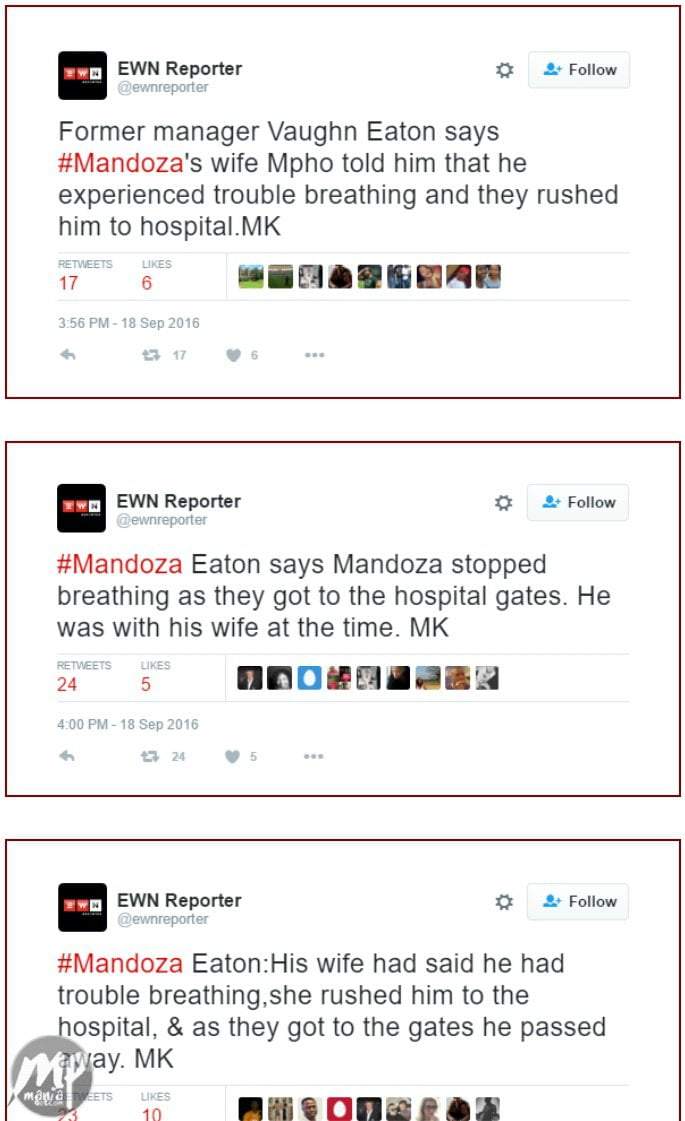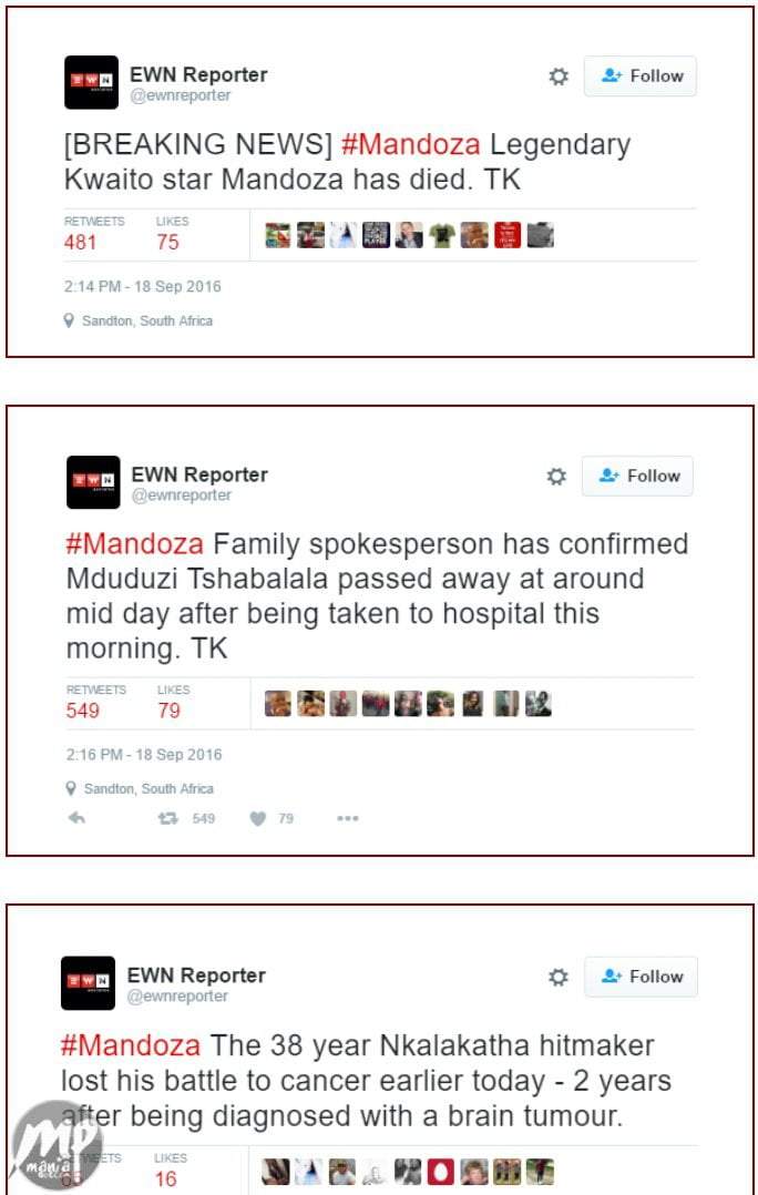 South African kwaito music star, Mduduzi Edmund Tshabalala aka Mandoza, has passed on.He died today September 18th after a long battle with cancer, which had reportedly spread to his brain, leading him to lose his sight completely.Reports Below Date: 2016-09-19 Category: Gist & Gossip