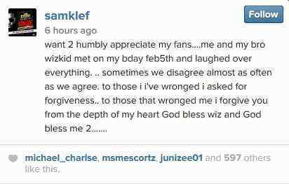 Errr… well, going by Samklef’s Instagram post some several hours ago whose caption was an expression of gratitude and forgiveness, it appears they have buried the hatchet with the Ojuelegba crooner’s simple gesture of turning up at his birthday on February 5th where they ‘laughed over everything’.