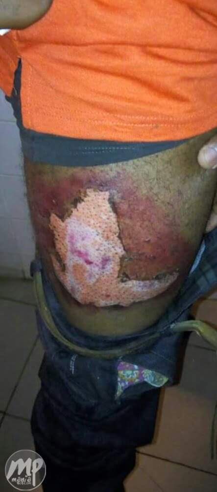 According to a facebook user, Uju Patricia, this man’s Samsung note 3 exploded in his pocket while on a bike, severely injuring him.