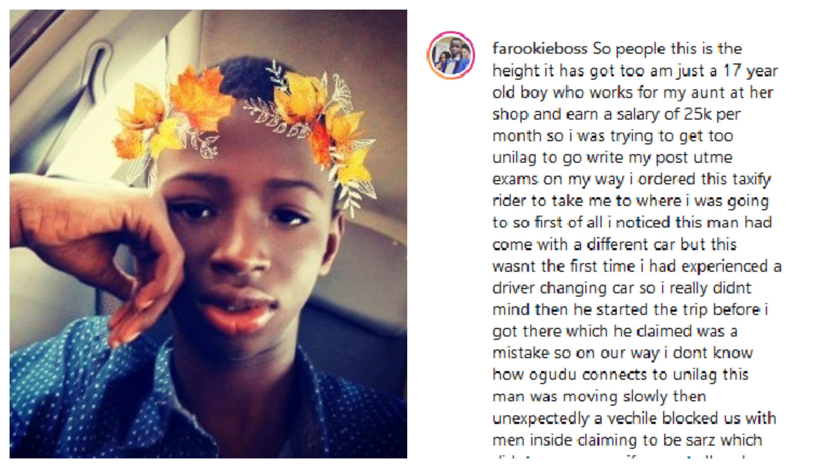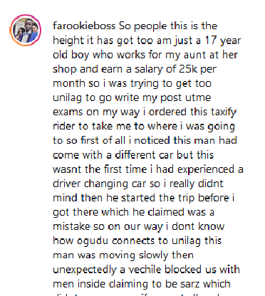 ”So people this is the height it has got too am just a 17 year old boy who works for my aunt at her shop and earn a salary of 25k per month so i was trying to get too unilag to go write my post utme exams on my way i ordered this taxify rider to take me to where i was going to so first of all i noticed this man had come with a different car but this wasnt the first time i had experienced a driver changing car so i really didnt mind then he started the trip before i got there which he claimed was a mistake so on our way.