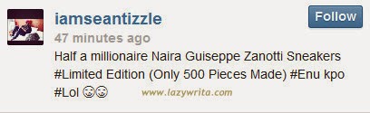 The artist posted the image on his instagram page with the caption “Half a millionaire Naire Guiseppe Zanotti Sneaker” Only God know how true this is. Date: 2014-01-03 Category: Gist & Gossip Tags: guiseppe zanotti, sean tizzle