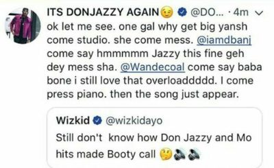 A hilarious conversation between Don Jazzy and Wizkid is causing a frenzy on social media. Wizkid sparked the conversation with a question directed at the ace producer. Wizkid asked the producer how he came about the hit song, Booty Call and with a hilarious response, Don Jazzy gave a narrative of how him, D’banj and Wande Coal put together the song.