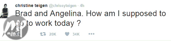 The model is one of those shocked over the power couple’s split.When people like that breakup, it messes with one’s beliefs in marriage. Anyway…hope their (Chrissy and Teigen’s) marriage lasts too. Date: 2016-09-21 Category: Gist & Gossip Tags: Angelina Jolie, brad pitt, Chrissy Teigen