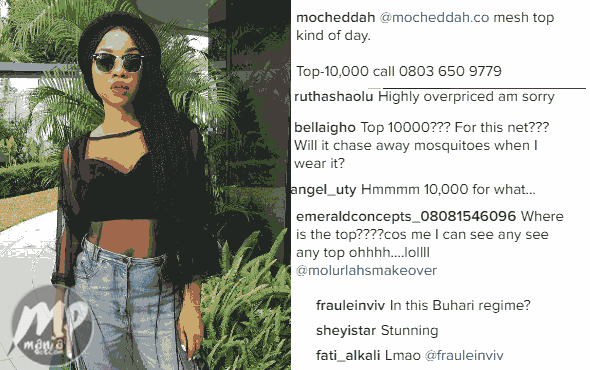 Mocheddah showed off this mesh top from her Mocheddah clothing line and listed the price at N10,000.Some fans felt it was too expensive. Is it really overpriced? Date: 2016-10-13 Category: Gist & Gossip Tags: mocheddah