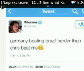 Lmaooooooo… The football world were caugth unexpectedly by what Germany did to Brasil today. See Rihanna’s tweet below; Date: 2014-07-08 Category: Gist & Gossip Tags: Brazil, Chris Brown - Christopher Maurice Brown, rihanna