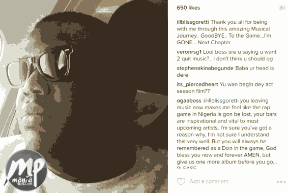 Nigerian rapper/hip-hop recording artiste, Tobechukwu Melvin Ejiofor, popularly known by his stage name Illbliss, announced his supposed retirement from music, via his Instagram page, today.