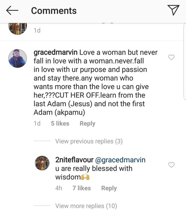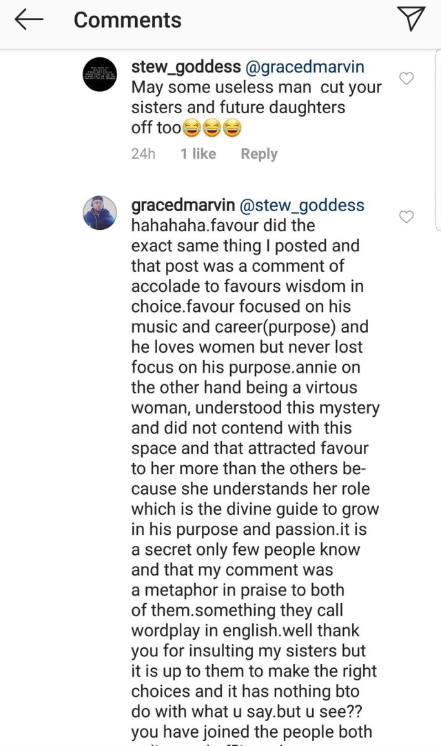 hahahaha.favour did the exact same thing I posted and that post was a comment of accolade to favours wisdom in choice.favour focused on his music and career(purpose) and he loves women but never lost focus on his purpose.annie on the other hand being a virtous woman, understood this mystery and did not contend with this space and that attracted favour to her more than the others because she understands her role which is the divine guide to grow in his purpose and passion.it is a secret only few people know and that my comment was a metaphor in praise to both of them.something they call wordplay in english.