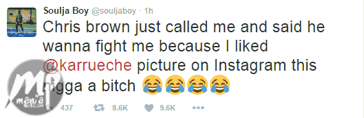 It appears the fastest way to get Chris Brown angry is by liking or commenting on Karrueche;’s pic.We are waiting for Chris Brown’s response.. Date: 2017-01-03 Category: Entertainment, Gist & Gossip Tags: Chris Brown - Christopher Maurice Brown, Karrueche Tran, Soulja Boy