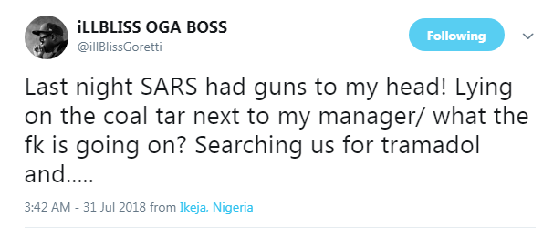 The rapper tweeted on Tuesday that the officials from SARS had guns to his head searching for tramadol, an opioid pain medication that has been recently abused and banned by the Federal government in Nigeria due to the danger it poses to the youth.