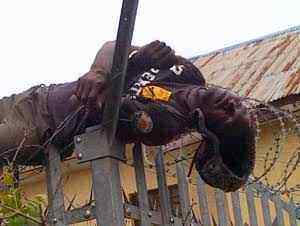 “A middle aged man was caught by an electrified wire when he was trying to steal diesel on Dagin Farouk road in Jos.Sources told Gistreel that the owner of the house electrified his security barbed wire in order to keep his place safe.” Date: 2014-10-07 Category: Gist & Gossip