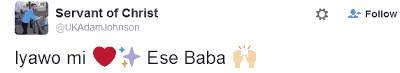 A British guy who goes by the name Servant of God @UKAdamJohnson on Twitter, posted a photo taken with his wife in Lagos and captioned it: “Iyawo mi…Ese Baba” Date: 2016-09-23 Category: Gist & Gossip