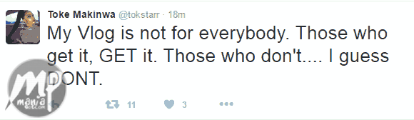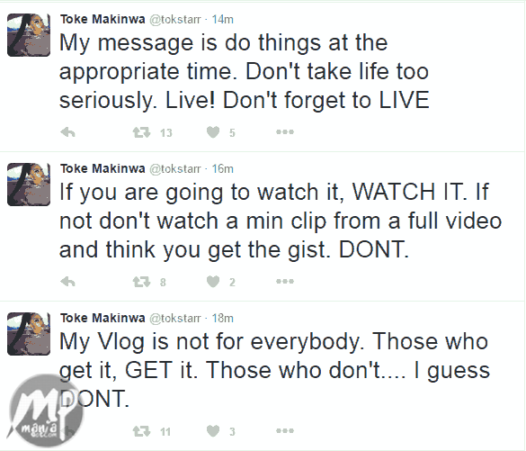 Following the backlash she faced over her recent Vlog where she spoke about some things young people should do before clocking 25 years old, Toke Makinwa took to twitter to say her clog isn’t for everyone and the message was for people to not take life too seriously.